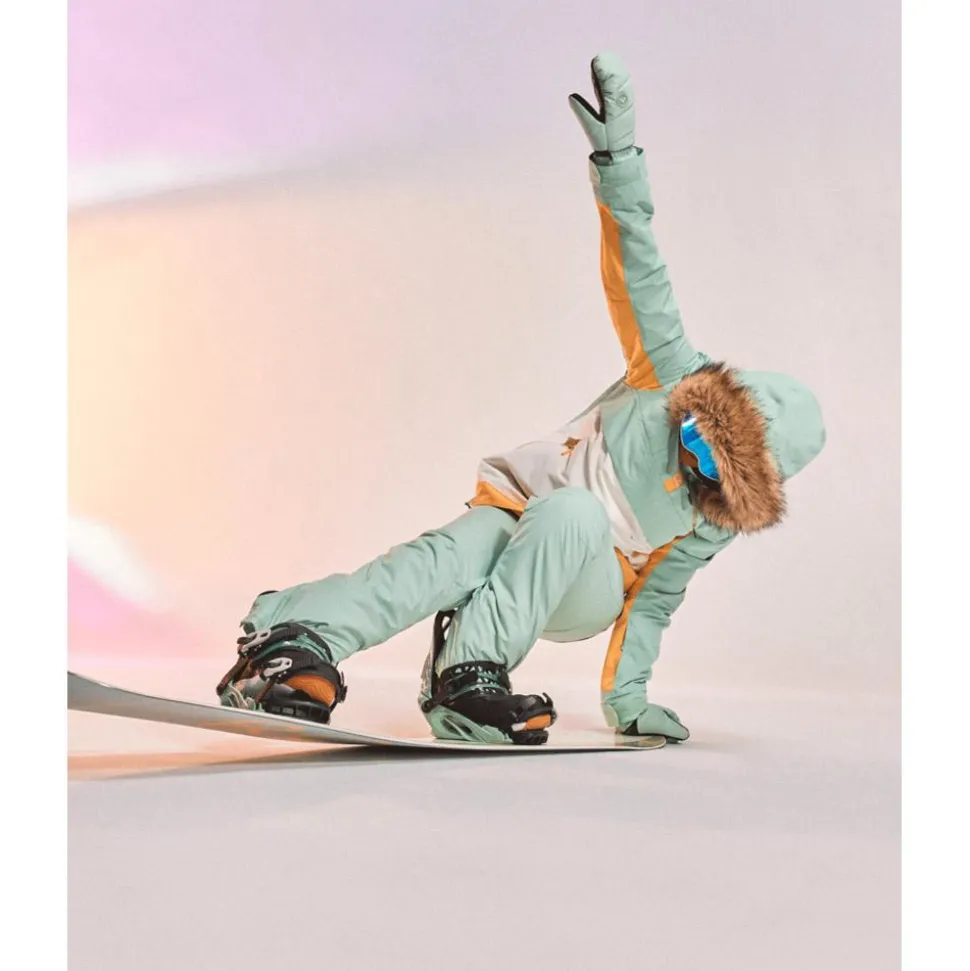 Pour ce qui est d’être préservée du froid, vous pouvez compter sur l’isolation WarmFlight, ainsi que sur la doublure en taffetas et tricot brossé. Ensemble, elles assurent une douce chaleur constante. Cette parka de ski est dotée d’une multitude de poches pratiques, dont une poche média interne et une poche forfait sur la manche. La capuche est joliment bordée de fausse fourrure amovible. Le système d’attache de la veste au pantalon favorisent un excellent maintien de votre tenue complète. La ventilation doublée en mesh sous les bras permet une aération efficace lors des efforts intenses.