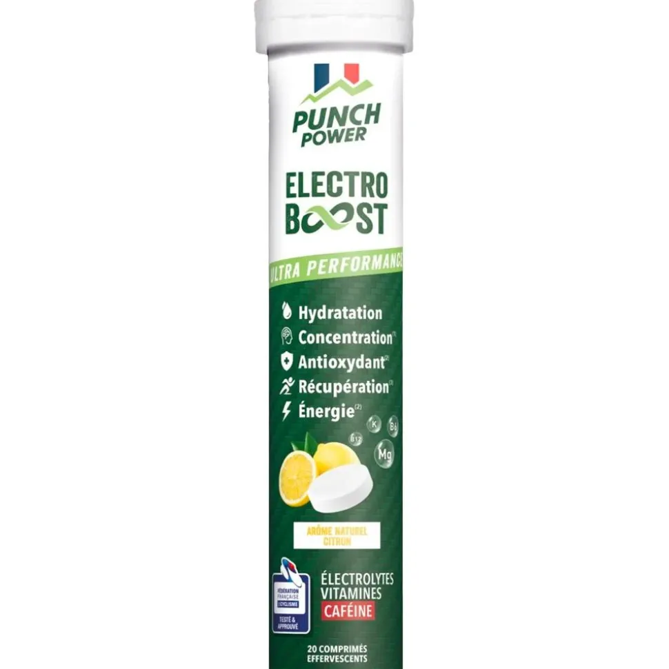 La boissonPunch Power Electroboost Tube 20 Comprimés Effervescents Citron Caféine accompagne vos efforts physiques en prévenant la déshydratation et en favorisant une contraction musculaire efficace.