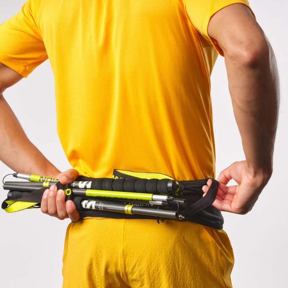 La Salomon Pulse Belt est une ceinture de running légère et stretch, avec des sangles pour bâtons et un emplacement pour une gourde de 500 ml.