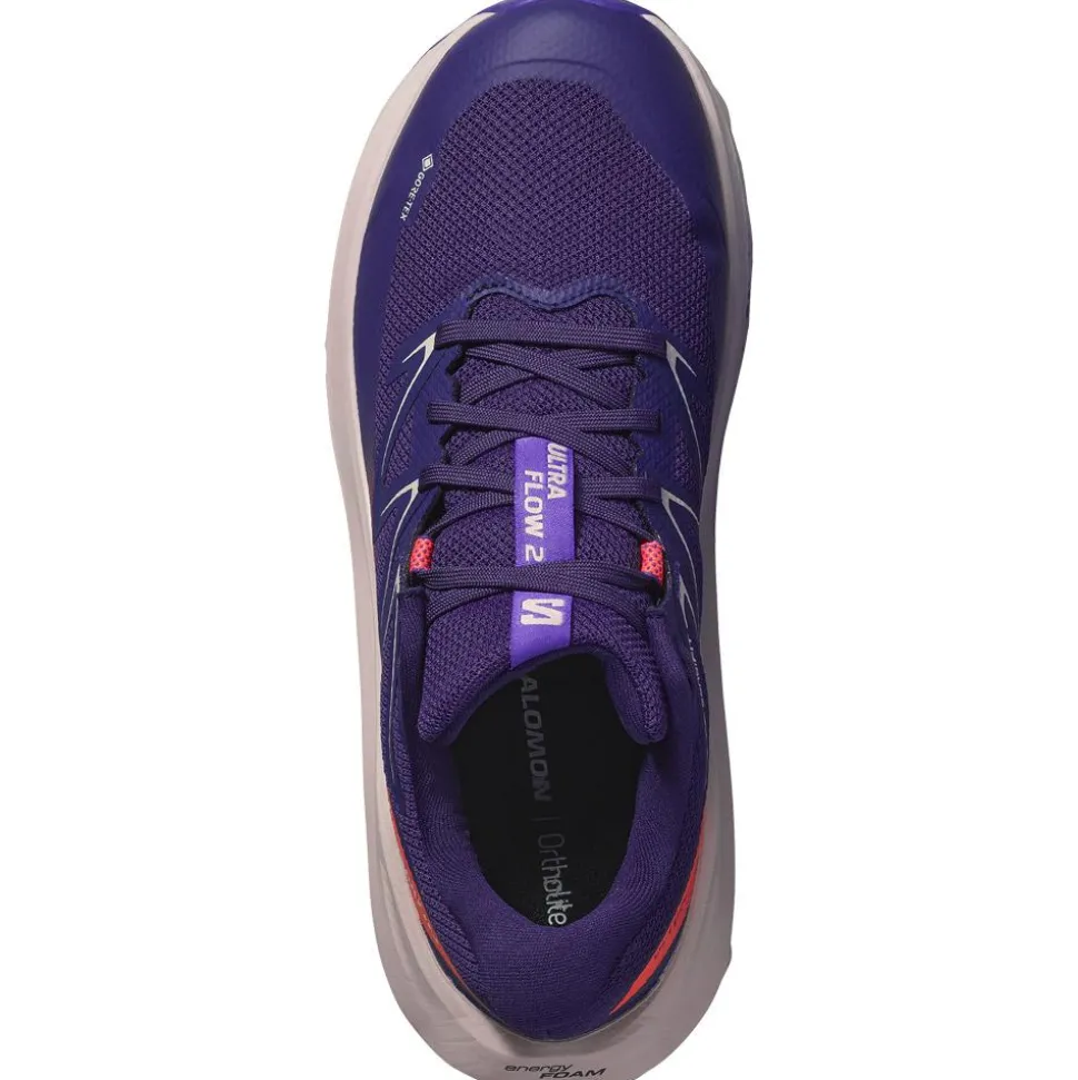 Les chaussures de trail femme Ultra Flow 2 Gore-Tex W Astral Aura Nirvana Neon Flame de Salomon offrent confort, imperméabilité et performance sur tous les terrains, même lors des sorties exigeantes.