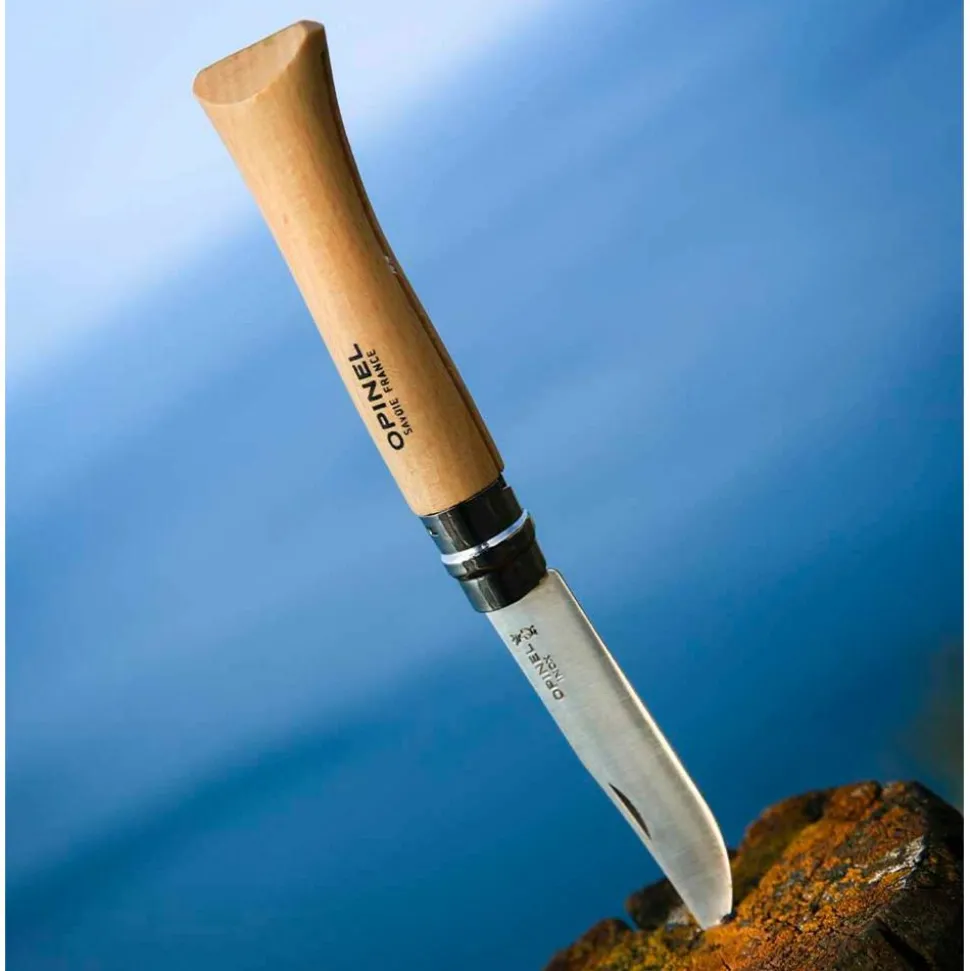 L’Opinel N°10 Inox, couteau robuste avec sa lame en acier inoxydable martensitique et son manche en hêtre français, se révèle idéal pour vos activités de plein air.