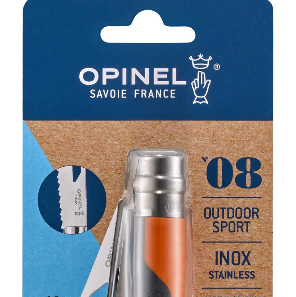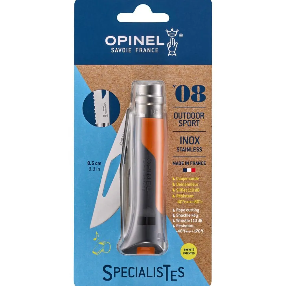 Le couteau N°8 Outdoor Blister Soft Orange d’Opinel intègre une lame inox, un manche antidérapant et unsifflet de secours.