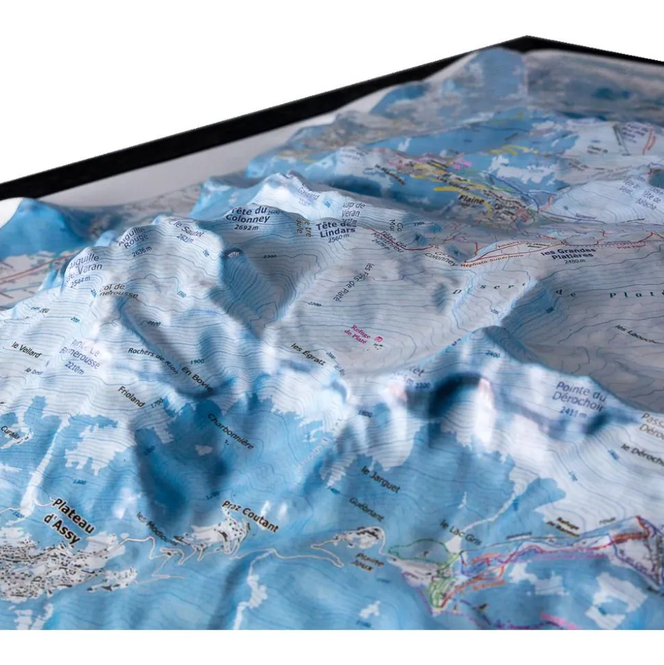 Grâce à la carte 3D Dénivelés, vous allez découvrirle Domaine LeGrand Massif avec un maximum de précision.Cette représentationen trois dimensions couvre les stations renommées de Flaine, Les Carroz, Morillon, Samoëns, Sixt-Fer-A-Cheval et Passy Plaine Joux, offrantun aperçu complet de ce vaste domaine skiable. Chaque remontée mécanique est soigneusement indiquée, permettant aux utilisateurs de naviguer avec aisance parmi les différentes stations. Les pistes de la saison 23/24 se dévoilent avec des annotations claires, chaque parcours étant identifié par son nom distinctif et un code couleur correspondant à son niveau de difficulté. Les points de restauration d’altitude sont également marqués, facilitant la planification des pauses gourmandes entre deux descentes. Les éléments architecturaux caractéristiques tels que les quartiers animés, les bâtiments historiques, les chalets chaleureux et les refuges accueillants sont tous illustrés, donnant vie à la carte. Des sommets majestueux comme la Tête Pelouse, Les Grands Vans et la Tête du Pré des Saix sont indiqués afin d’inviter lesaventuriers à contempler ces géants de la nature.