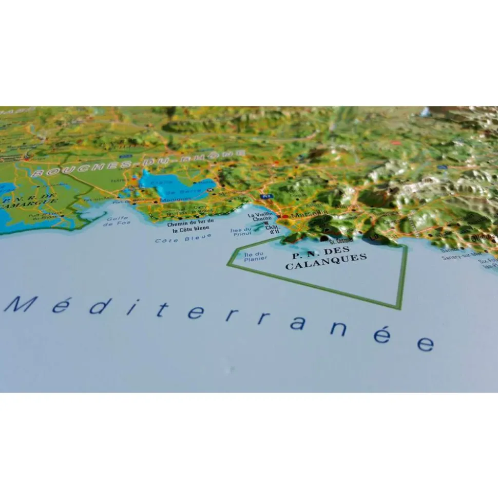 Les cartes 3DMAP sont fabriquées en France et apportent une nouvelle dimension à la cartographie, au sens propre comme figuré. Grâce à un logiciel de traitement 3D développé spécifiquement pour ces cartes, on obtient un niveau de finition tout à fait exceptionnel, rendant ces cartes aussi belles que détaillées. Sur ce modèle, vous aurez une belle vue d’ensemble sur tout le sud-est du pays. Avec toute la vallée du Rhône jusqu’à la Méditerranée à l’ouest, le lac Léman au nord et la frontière italienne à l’est, vous pourrez admirer tout le massif alpin, ses sommets, les plus beaux villages de France ou encore les stations de ski. Tous les sites dignes d’intérêt y sont recensés.