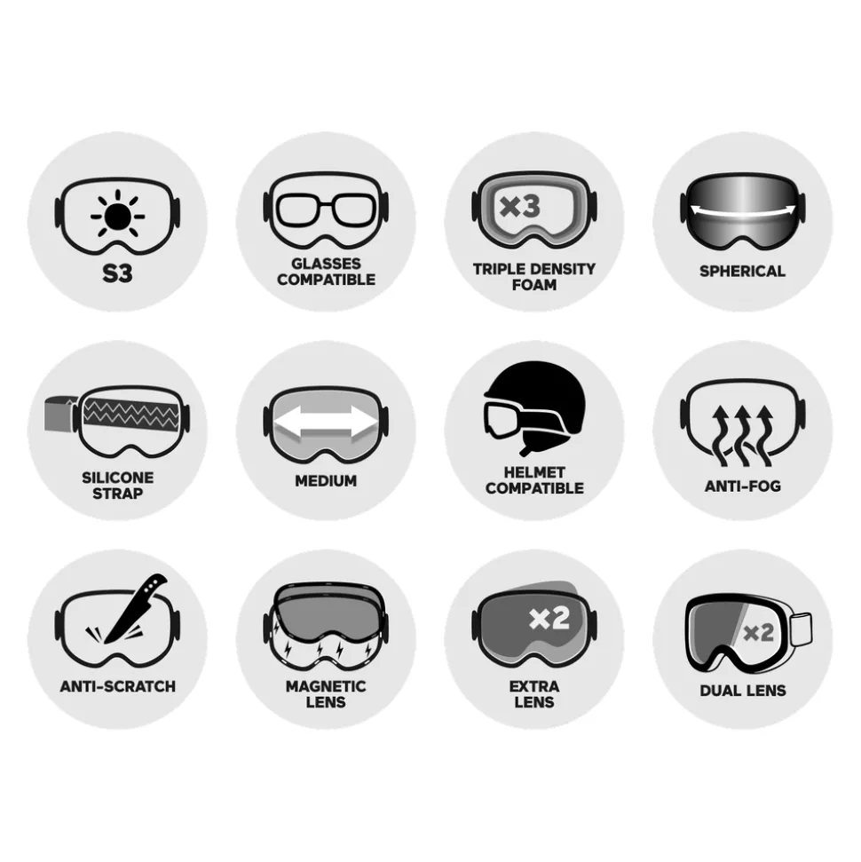 Compatible avec le port du casqueEcran sphériqueDouble écran avec protection anti-rayuresTraitement anti-buée et anti-rayuresMousse triple densitéStrap siliconé -