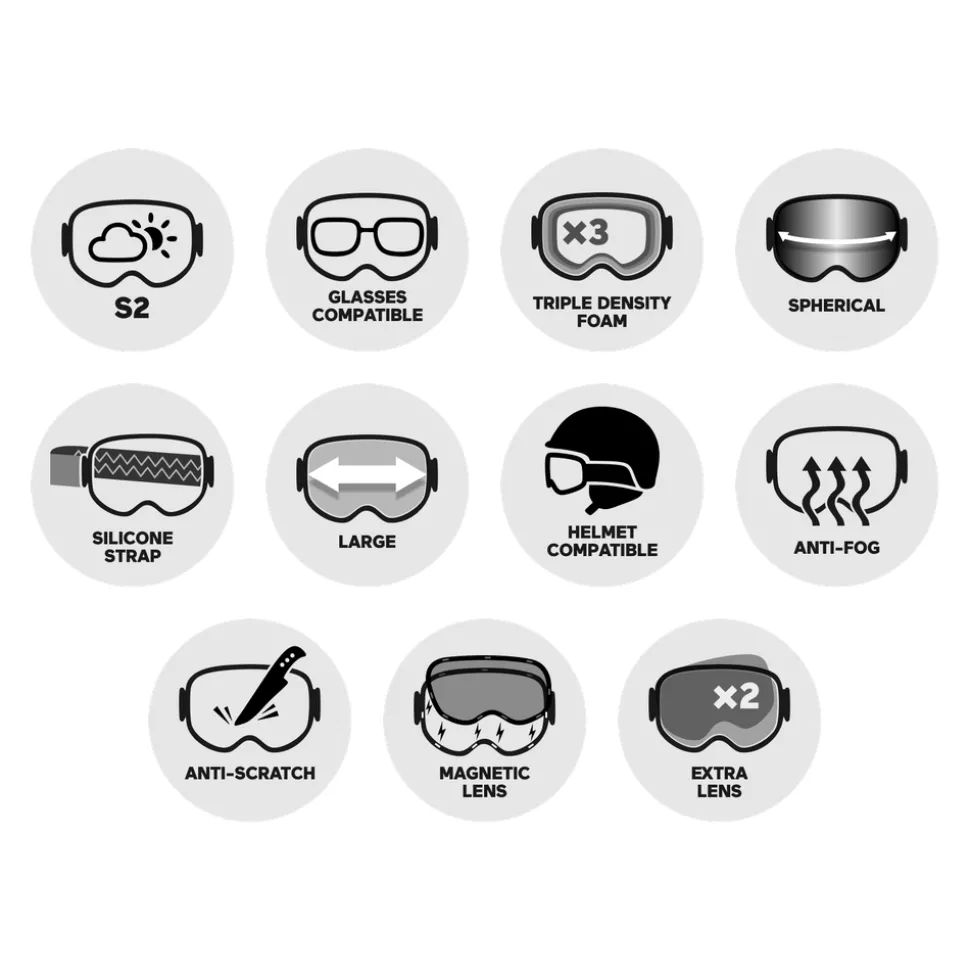 Custom Id FitChamp de Vision LargeEcran sphériqueCompatible avec le port du casqueVision MaximaleStrap siliconéMousse triple densitéTraitement anti-buée et anti-rayuresEcran Facilement Interchangeable -