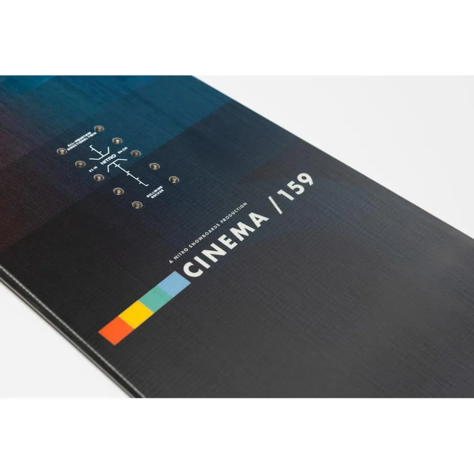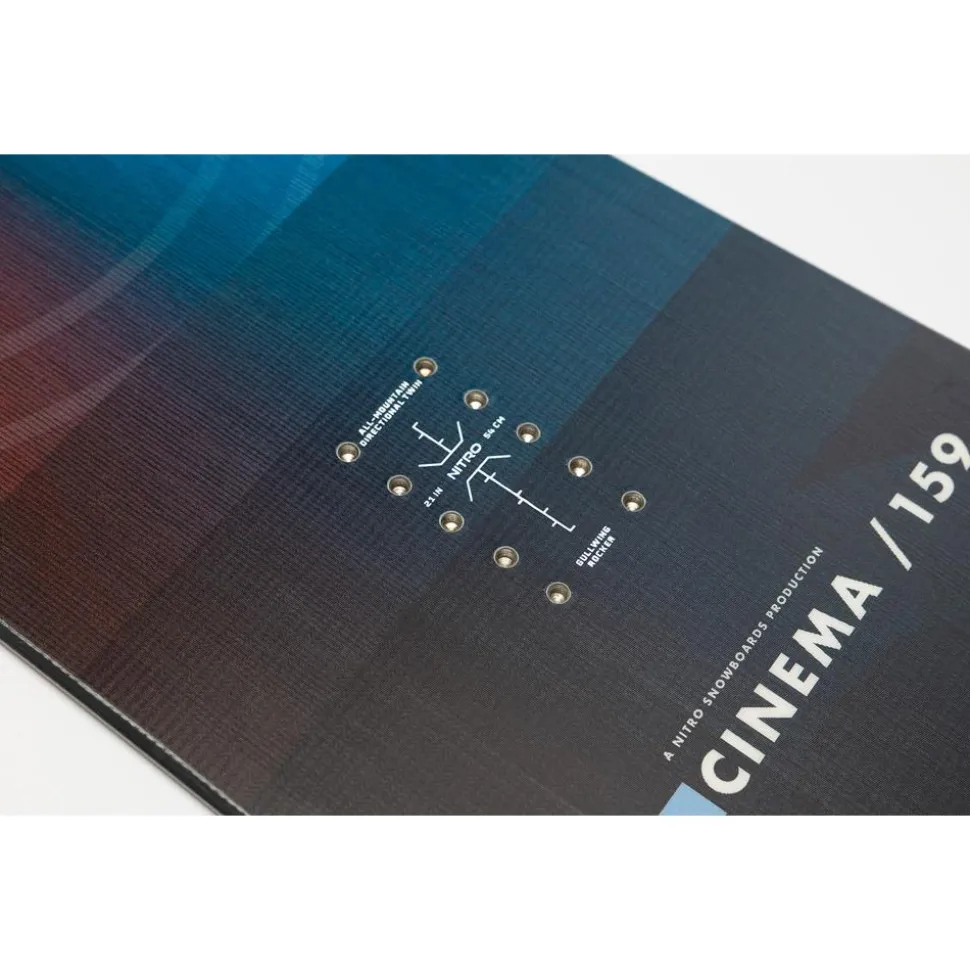 La Cinema est une planche au shape twin directionnel, symétrique du nose au tail, offrant ainsi une excellente maniabilité en switch et une grande jouabilité. La position légèrement reculée des pieds favorise la glisse en poudreuse et facilite la conduite en courbe. Avec un flex plutôt souple, elle permet de lancer des tricks facilement, que ce soit en flat avec des press et butters ou en jib sur les rails et boxes. Son cambre hybride combine cambre classique et inversé, offrant un bon compromis entre accroche, flottaison et tolérance. Ce profil permet de rider sur tout type de neige avec beaucoup de jouabilité. La Cinema excelle sur tous les terrains et dans toutes les conditions, offrant plaisir et performance en poudreuse, facilité de pivotement et efficacité en flat.