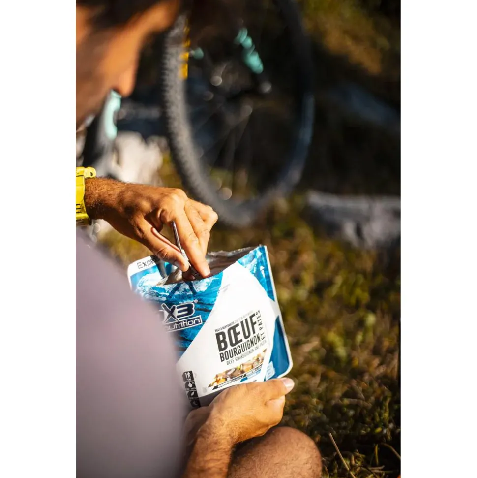 Le MX3 Bœuf Bourguignon & Pâtes est un repas lyophilisé énergétique et pratique, parfait pour les aventuriers appréciant la cuisine française traditionnelle.