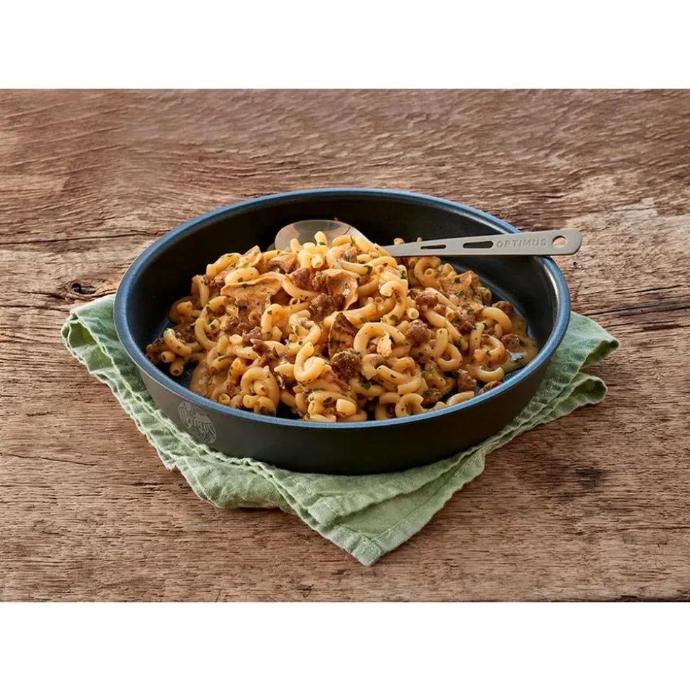 Le Boeuf Chasseur aux pâtes est un plat principal qui fera votre bonheur en trek. Son mélange de boeuf, de pâtes, de champignons et ses condiments (persil, romarin, céleri, sel, poivre) le rendent à la fois goûtu et riche, pour que vous puissiez repartir à fond sur les chemins de montagne.