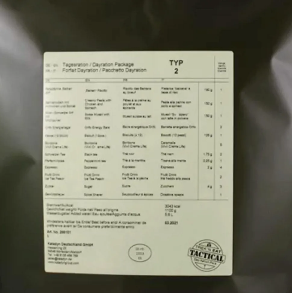 Le Day Ration Pack Type 2de chez Trek’n Eatpropose un assortiment de repas sur mesure pour une personne durant une journée entière. Ce pack se compose principalement de repas lyophilisés Trek’n Eat, dont le procédé préserve les vitamines et minéraux essentiels tout en éliminant l’humidité. Ainsi, Trek’n Eat offre une nutrition optimale pour faire le plein d’énergie. Les Packs Ration Journalière sont enrichis d’aliments choisis avec soin, tels que boissons, barres et snacks.