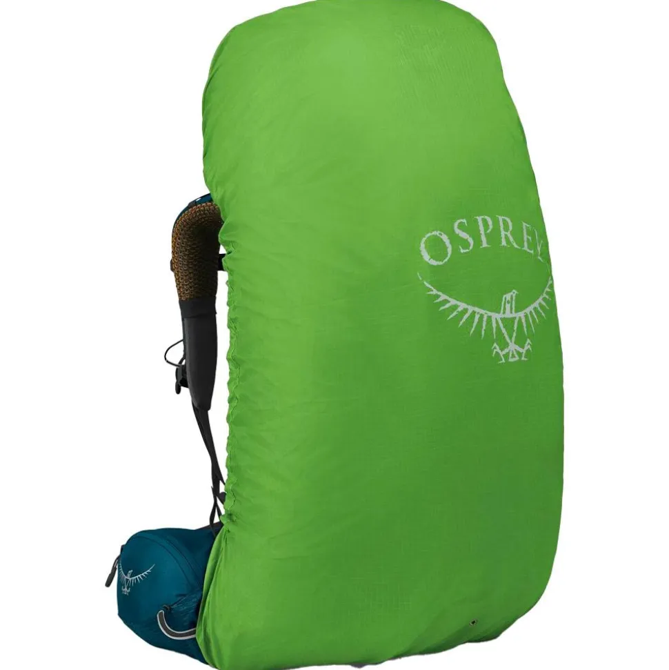 Le sac à dos adulte écoresponsable Osprey Atmos Ag 65 Venturi Blue est idéal pour les randonnées et voyages de 3 jours et plus, offrant une bonne protection de vos affaires contre les éléments grâce à sa housse déperlante DWR sans PFC/PFAS.