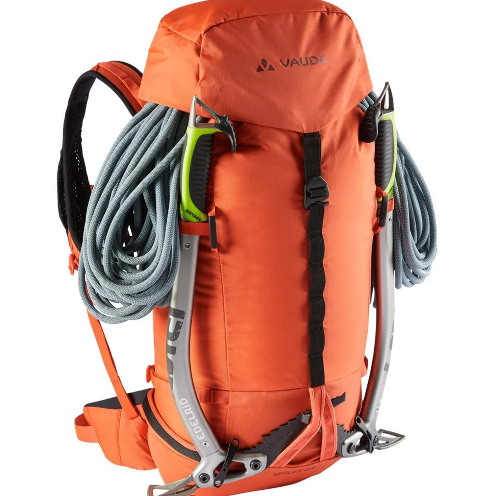 Conçu pour l’alpinisme ou le ski de randonnée, le sac à dos Vaude Serles 32 est un modèle très léger, robuste et écoresponsable, utilisant une part de polyester recyclé dans sa fabrication. Un traitement déperlant durable et écologique EcoFinish est appliqué pour protéger le contenu du sac des intempéries passagères. Très bien accessoirisé, il intègre une fixation latérale pour les skis, des systèmes de port du casque, de piolets et de cordes, ainsi qu’une poche pouvant accueillir un système d’hydratation. Les bretelles ErgoShape et la sangle de poitrine augmentent le confort en répartissant efficacement la charge, sans entraver la liberté de mouvement.