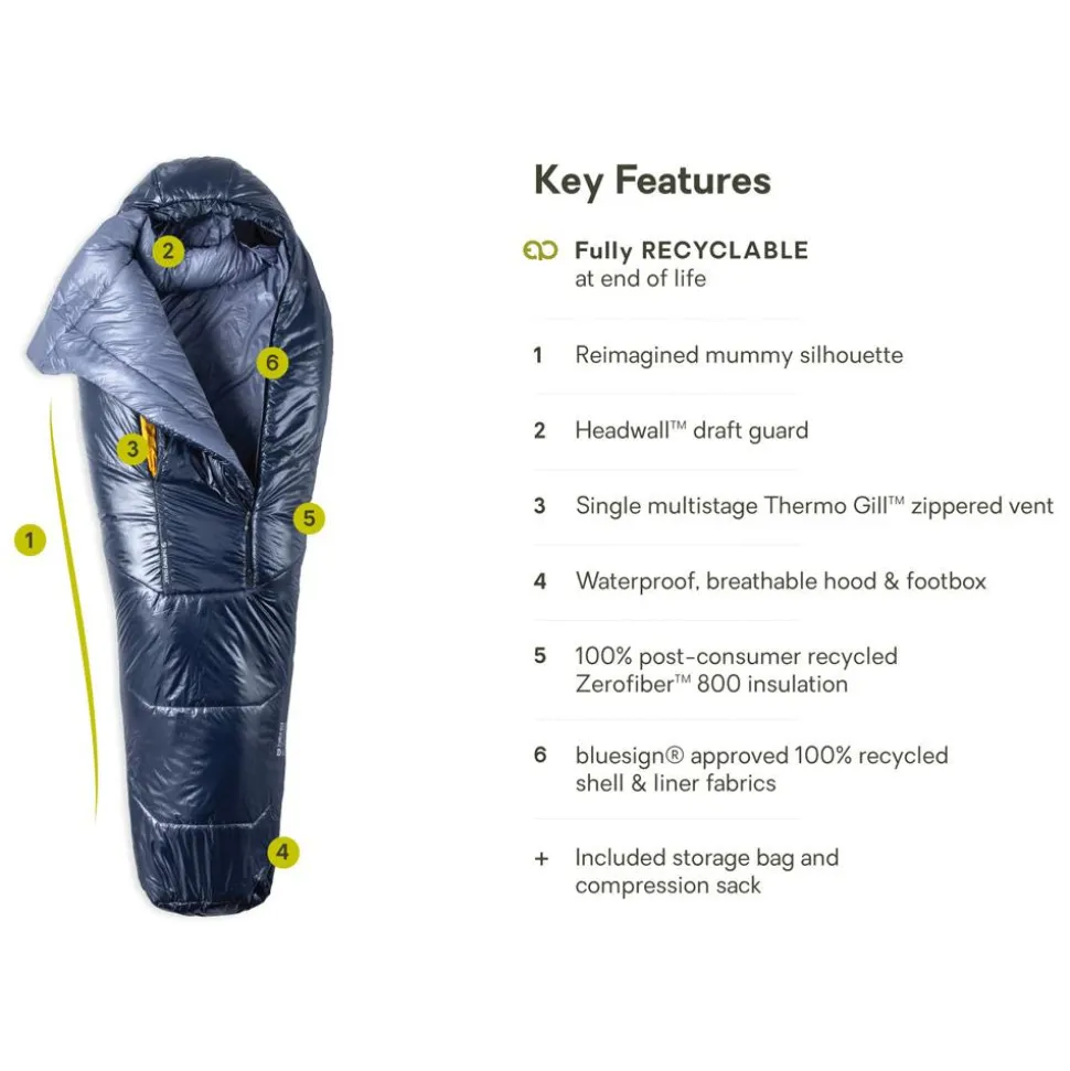 Le sac de couchage Nemo Soul 30/40 offre une solution performante pour les nuits en bivouac par 5°C tout en étant écoresponsable, grâce à son garnissage synthétique Zerofiber 800, son polyester Ripstop et son taffetas 100 % recyclés.La forme momie optimise la chaleur en limitant la quantité d’air à réchauffer, tandis que la capuche large et le système HeadwallTM assurent une isolation à 360°. Le traitement déperlant DWR sans PFC renforce la résistance à l’humidité, un atout pour affronter la rosée ou les intempéries.