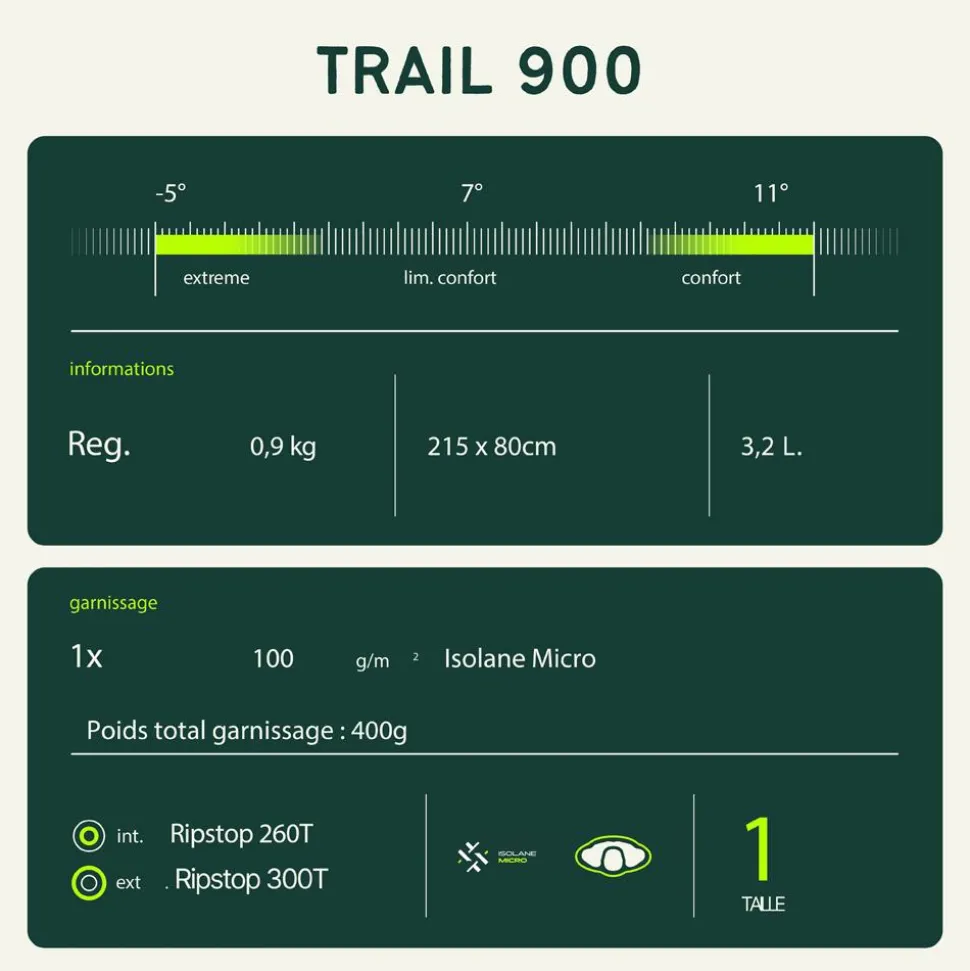 Caractéristiques du sac de couchage Trail 900 :