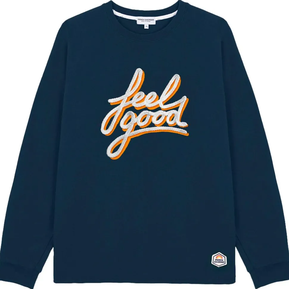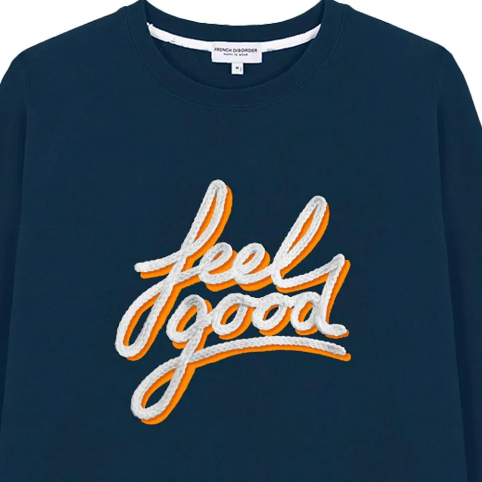Le sweat French Disorder Lenny Feel Good Tricotin Stone Blue séduit par sa douceur, sa coupe décontractée et son message brodé qui invite à la bonne humeur.