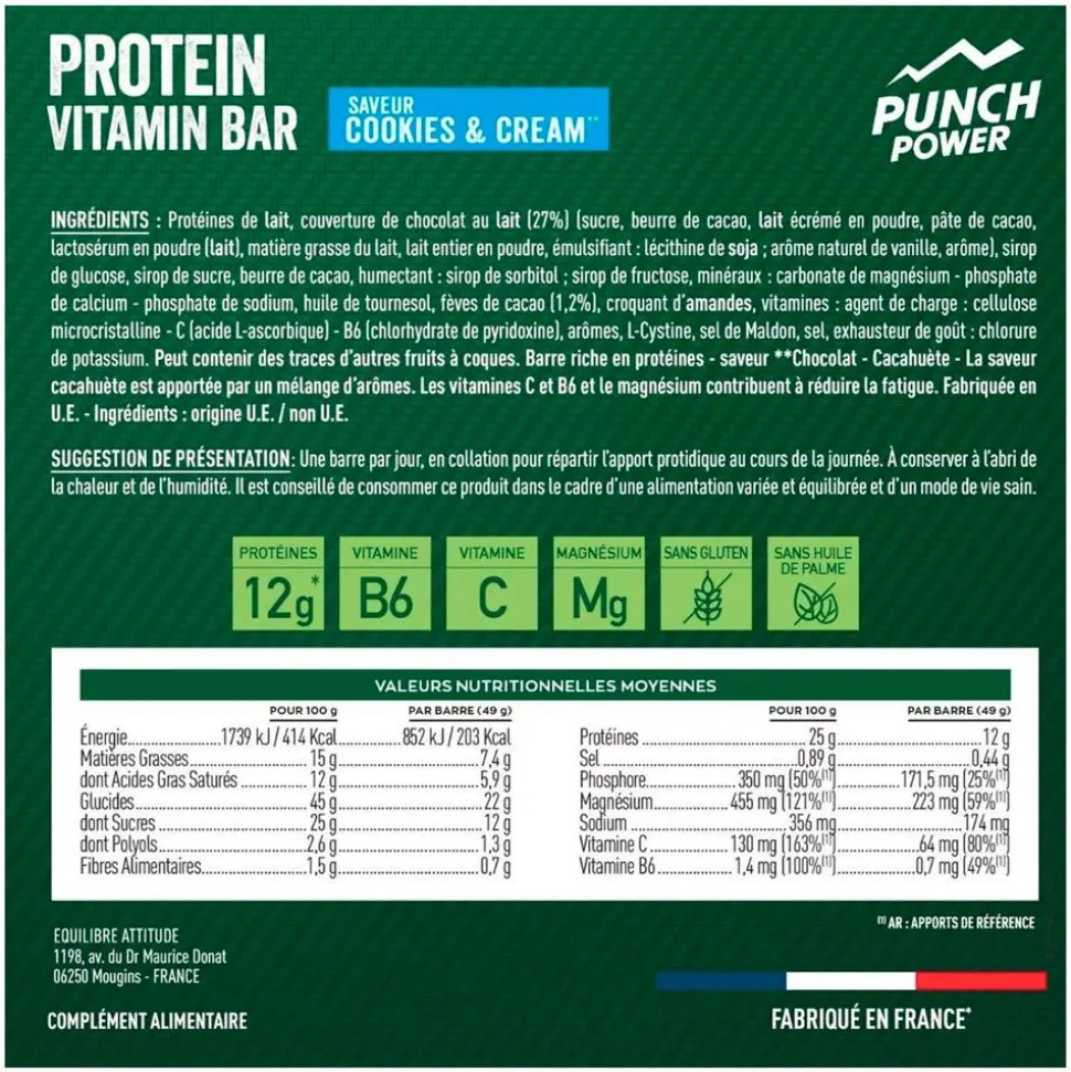 La barre énergétique Punch Power Protein Vitamin Bar 49 g a été élaborée pour répondre aux besoins nutritionnels des sportifs pratiquant des activités outdoor. Riche en protéines et en glucides, elle est prête à être consommée avant ou après l’effort. Elle est sans gluten ni huile de palme et fournit environ 203 kcal.