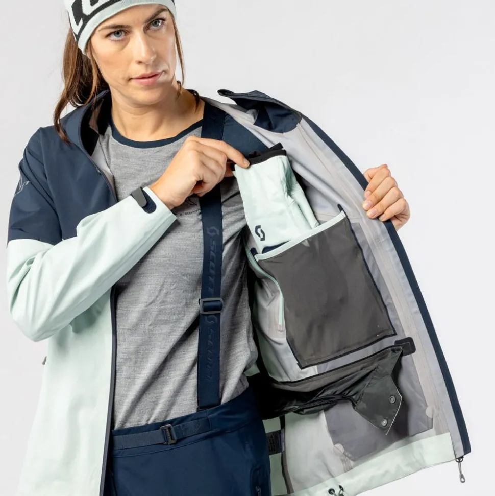 Le blouson de ski Scott W’s Explorair 3L Fresh Green Dark Blue, fabriqué en polyester recyclé, assure une protection contre les intempéries avec sa membrane Dryosphere, tout en offrant des fonctionnalités ajustables pour un confort personnalisé.