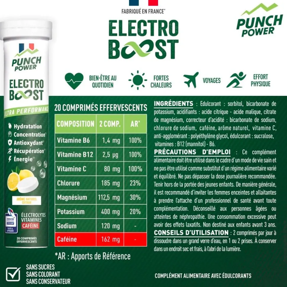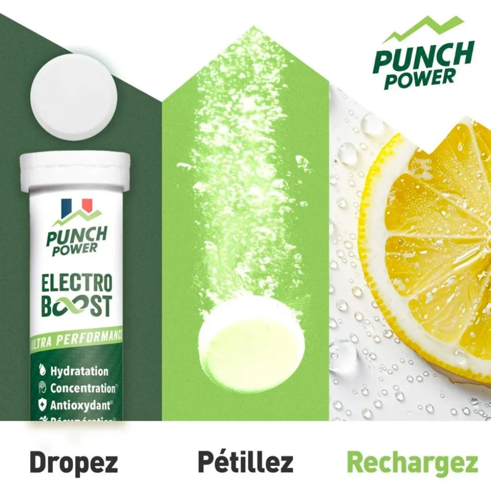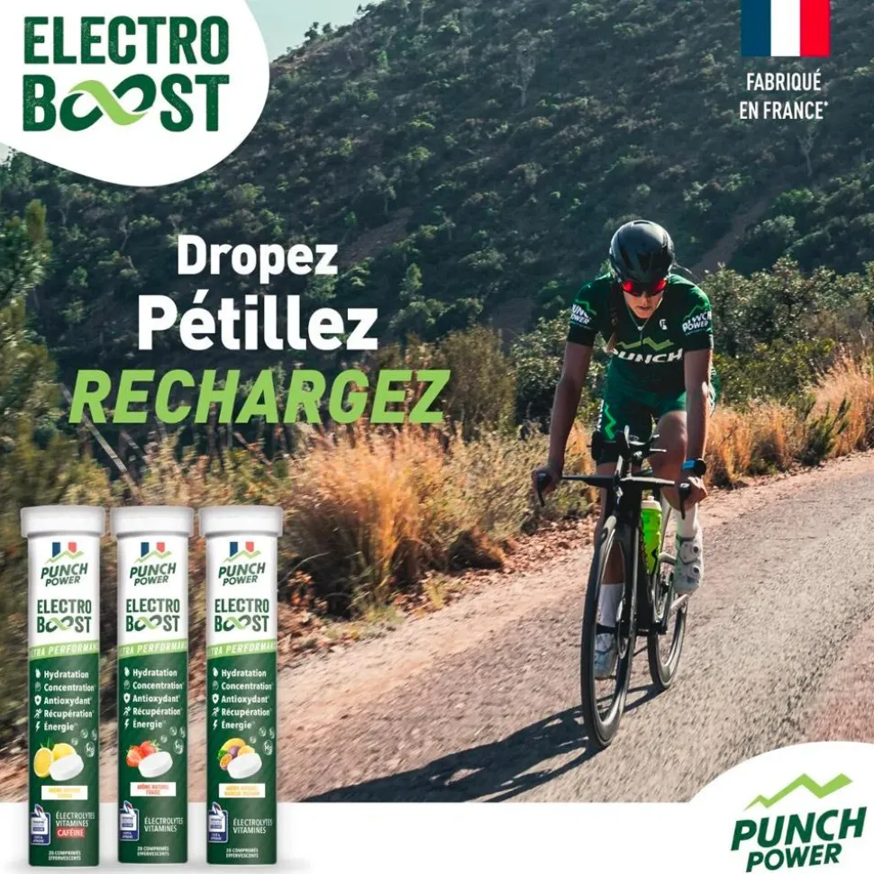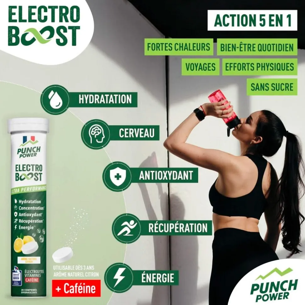 La boissonPunch Power Electroboost Tube 20 Comprimés Effervescents Citron Caféine accompagne vos efforts physiques en prévenant la déshydratation et en favorisant une contraction musculaire efficace.