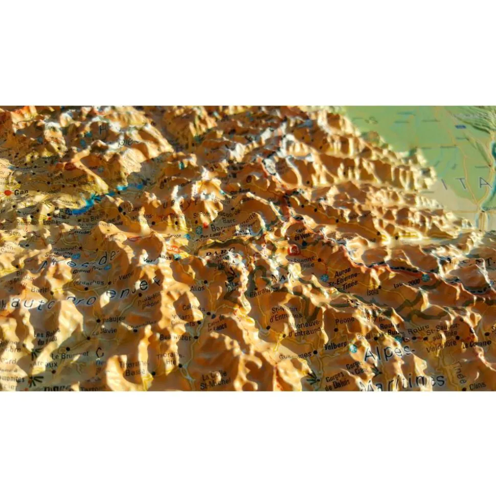 Les cartes 3DMAP sont fabriquées en France et apportent une nouvelle dimension à la cartographie, au sens propre comme figuré. Grâce à un logiciel de traitement 3D développé spécifiquement pour ces cartes, on obtient un niveau de finition tout à fait exceptionnel, rendant ces cartes aussi belles que détaillées. Sur ce modèle, c’est la belle région de Provence Alpes Cote d’Azur (PACA) qui montre ses secrets. Des villes d’art aux chateaux, des sites naturels aux stations de ski, vous passerez de la mer à la montagne en ayant l’impression d’y être.