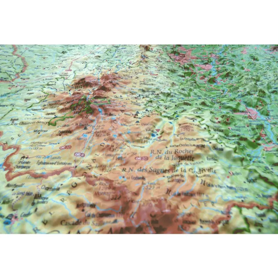 Les cartes 3DMAP sont fabriquées en France et apportent une nouvelle dimension à la cartographie, au sens propre comme figuré. Grâce à un logiciel de traitement 3D développé spécifiquement pour ces cartes, on obtient un niveau de finition tout à fait exceptionnel, rendant ces cartes aussi belles que détaillées. Sur cette carte, c’est le département du Puy-de-Dôme que vous pourrez décrouvrir en détail, la chaîne des Puys et ses 80 volcans, le massif du Sancy, le Livradois, le Forez, la Limagne, les Combrailles, etc. Vous pourrez vous projeter et imaginez vos prochaines activités sportives et autres escapades touristiques qui vous permettront d’explorer cette magnifique partie de la France.