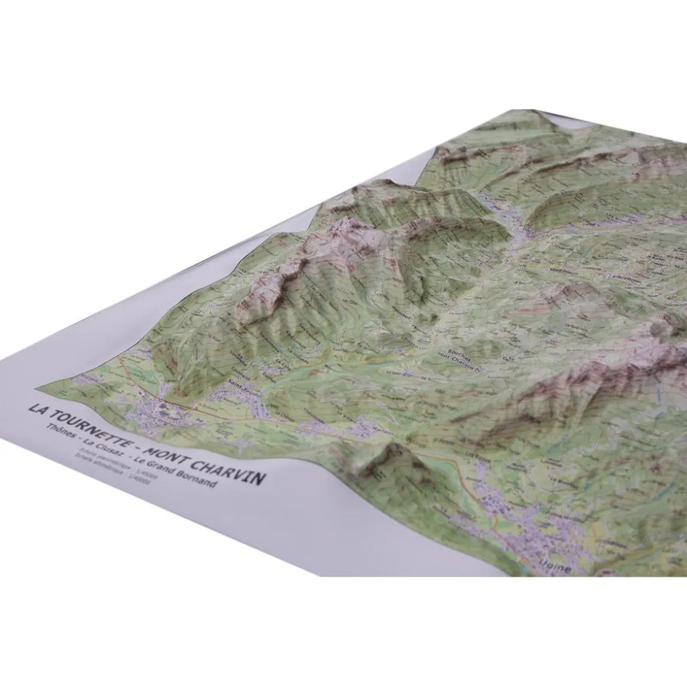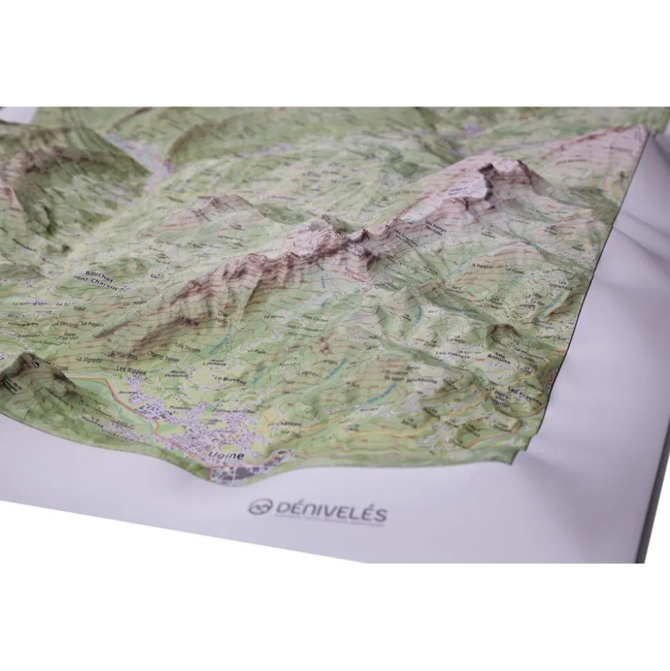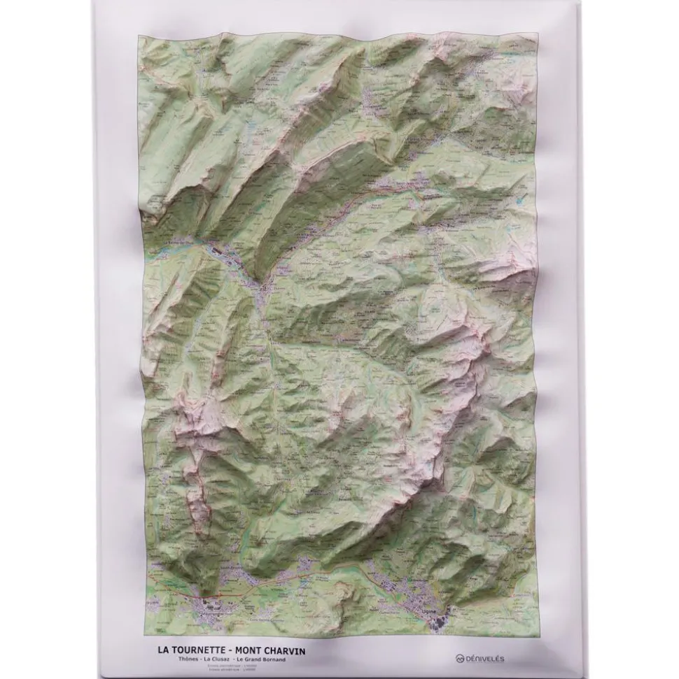 Conçue par la société d’édition auvergnate Dénivelés, la carte topographique 3D propose de s’immerger dans les reliefs montagneux de La Tournette et du Mont Charvin. Les amoureux de nature et les passionnés d’activités outdoor (ski de rando, trail running, parapente, varappe, escalade, alpinisme, vélo, VTT, randonnée, …) peuvent ainsi découvrir leurs futurs spots : au sud-est, l’aiguille du Bouchet et les aiguilles du Mont constituent le pied des Aravis d’où se détache le Mont Charvin qui culmine à 2 409 m d’altitude. Sur l’autre rive de la vallée du Nom, plus au nord-ouest, un ensemble de chaînes concentriques coupées par le Fier forme un relief atypique d’où s’échappe les monts de La Tournette, le Mont Lachat, la montagne des Auges et plus au nord la montagne des Frêtes. Idéale pour préparer vos prochaines sorties, cette carte en relief avec courbes de niveau permet d’appréhender les cols, les sommets, leur altitude, les crêtes, les combes et les vallées.