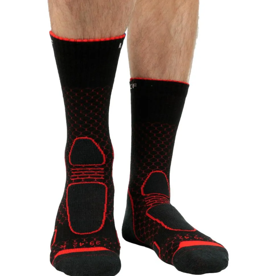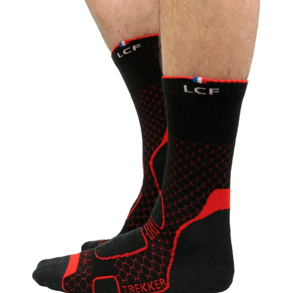 Les chaussettes de randonnée La Chaussette de France Trekker High Noir Rouge sont confortables, résistantes et évacuent l’humidité efficacement grâce à leur tricotage en Nid d’Abeille et leur concept Assymetrical.