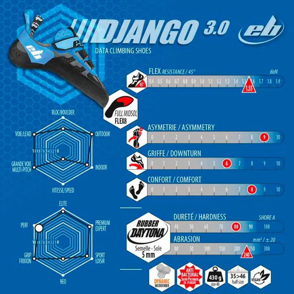 L’EB Django 3.0 est un chausson d’escalade pensé pour les grimpeurs aguerris, avec une forme très asymétrique, une griffe bien marquée et une rigidité qui permettent d’avoir un maximum de sensations pour charger les plus petites prises. La semelle en caoutchouc Daytona de 5 mm apporte toute l’adhérence nécessaire. L’inconfort créé par la contrainte de la forme de ce chausson est légèrement compensé par la tige en microfibre élastique qui épouse votre morphologie de pied, tout en apportant un gain de précision. Un chaussant idéal pour la voie, particulièrement pour l’escalade sportive sur les couennes.