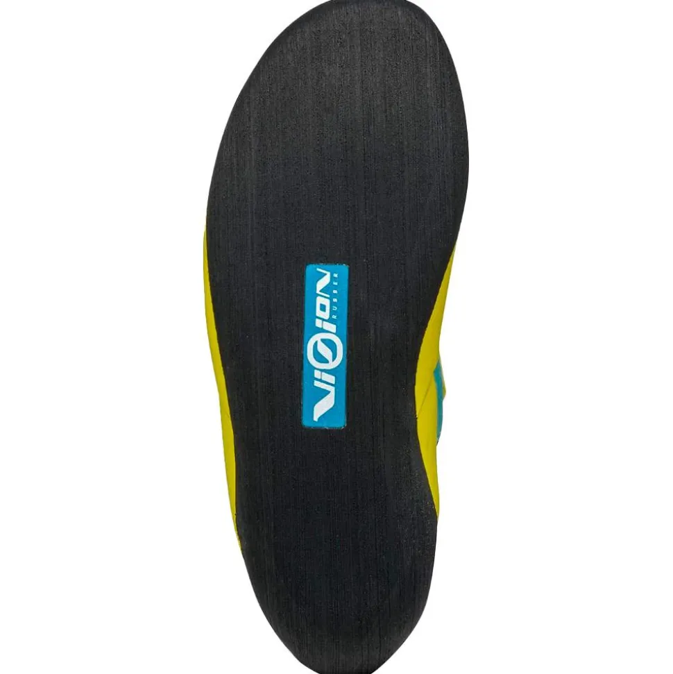 La Scarpa Piki J, ici en coloris Maldive Yellow, est une chaussure d’escalade pour enfant, avec une construction néoprène qui s’étend légèrement avec la croissance du pied.