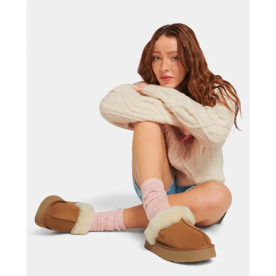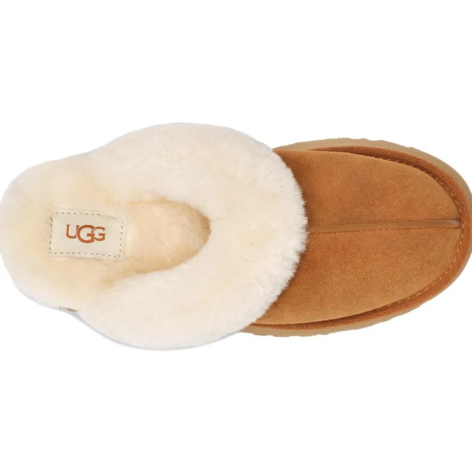 Les chaussons UGG W Disquette Chestnut pour femmes allient confort et style avec une semelle rétro de 2,5 cm et des matériaux durables.