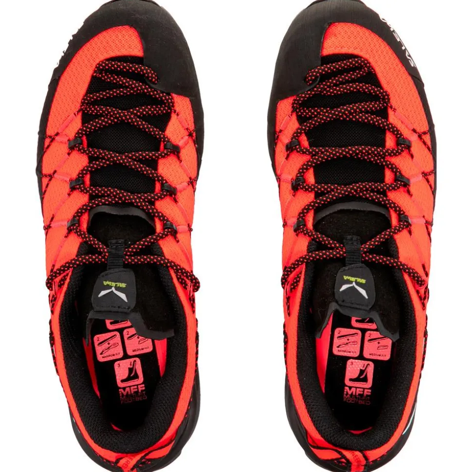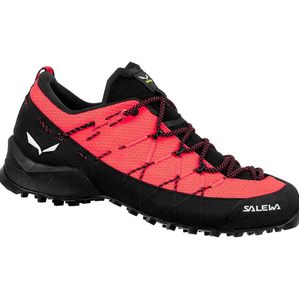 Modèle technique de chez Salewa à destination des grimpeuses, la chaussure approche femme Wildfire 2 Wmn Fluo Coral Black bénéficie d’une semelle Pomoca Speed Mountain