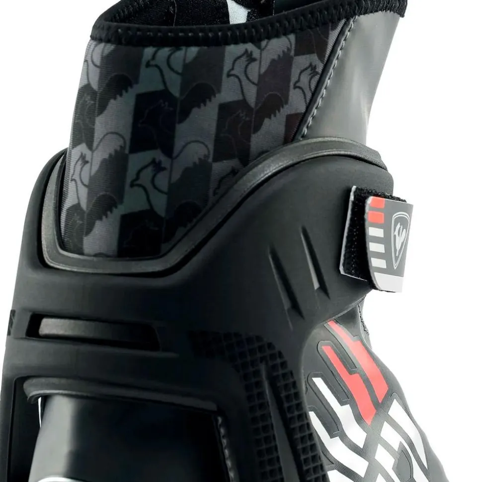 Pourbien comprendre cette chaussure il est utile de faire un petit comparatif avec le modèle X-8 FW si on la regarde de plus près, on s’aperçoit que le collier est un peu plus imposant, et ce pour uneraison ;plus de rigidité.Avec la X-10 FW on recherche plus de maintien latéral car on s’adresse à des skieuses un peu plus techniques qui ont besoin de plus de garanties lorsqu’elles posent le pied. Le châssis très enveloppant est voué au maintien du talon, sanscela inutile de penser pouvoir guider le ski correctement sur neige dure. C’est un point primordial de la chaussure de skating, et le couple que forment le collier et le châssis se doit d’assurer à lafois la stabilité latérale et le blocage de la zone talon.Dans cette optique de rigidité plus importante, Rossignol a équipé la X-10 d’une semelle Expert Skate plus rigide, il en résulte une proximité accrue entre la chaussure et leskien fin de poussée et moins de perte d’énergie qu’avec une semelle plus souple. Pour le laçage, comme sur la plupart des modèles La X-10 Skate FW est munie duSpeedlaceLock, unsystèmede laçage rapide et enveloppant qui fournit un ajustement homogène autour du pied.Enfin, elle est compatible aux normes de fixations NNN,ProlinketTurnamic.