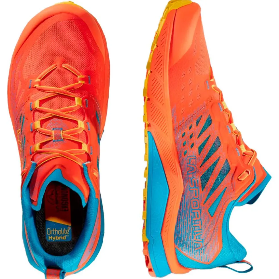 Les chaussures de trail Jackal II Cherry Tomato Tropic Blue de La Sportiva offrent légèreté, amorti performant et maintien optimal grâce à une conception axée sur le confort et les matériaux recyclés.