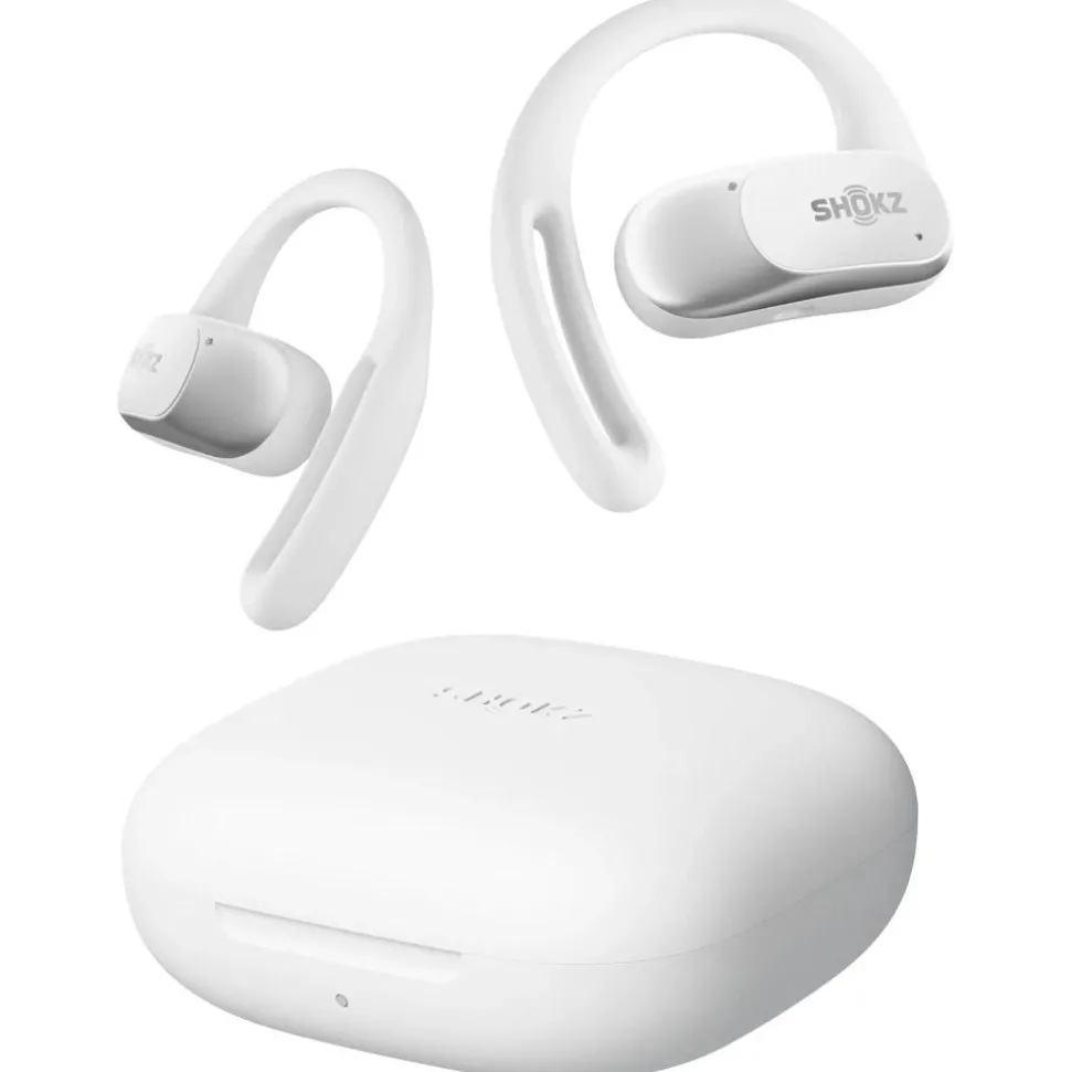 Les écouteurs OpenFit Air Blanc de Shokz allient ergonomie et son haute qualité avec technologie OpenBass Air, Bluetooth 5.2, commandes tactiles et grandeautonomie.