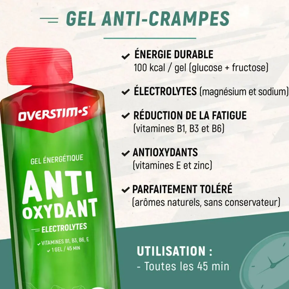 Le gel énergétique Overstims répond au nom d’Antioxydant 34 g et se distingue par une composition étudiée pour accompagner l’effort physique. Proposé dans un format de 34 g, ce produit offre une expérience gustative à la pomme verte. Ce gel peut s’avérer utile dès le début de l’activité et à intervalle régulier, toutes les 45 minutes, et dispose de la possibilité d’être dilué.