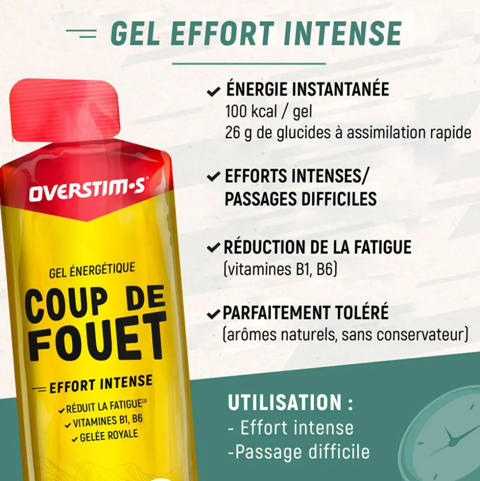 Le gel Coup De Fouet goût Citron de Overstims est un gel énergétique vitaminé qui apporte un regain d’énergie immédiat au besoin lors de vos courses.