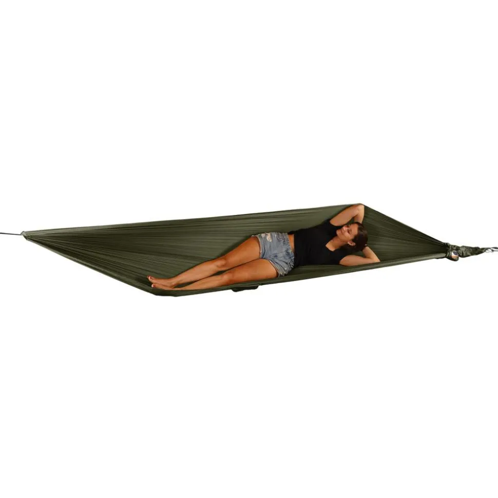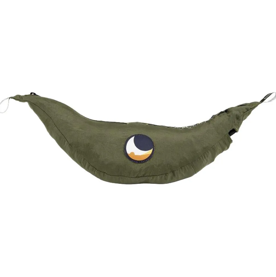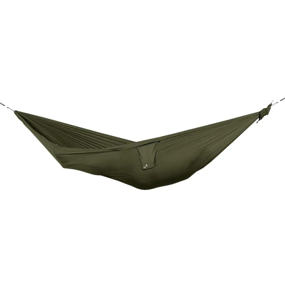 Le hamac Compact Hammock Army Green de Ticket To The Moon est un modèle léger et pratique, fabriqué en nylon parachute durable, avec une poche latérale intégrée et une capacité de charge maximale de 200 kilos.