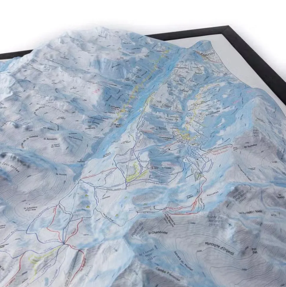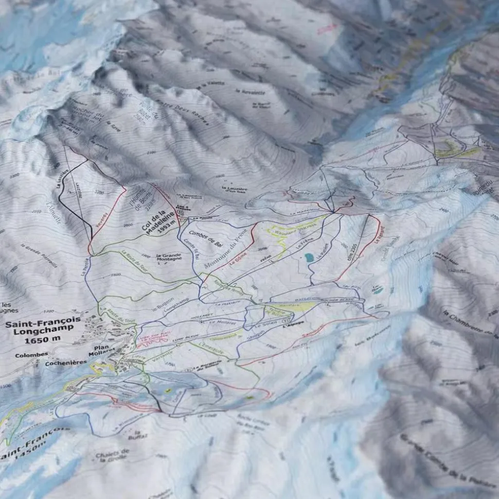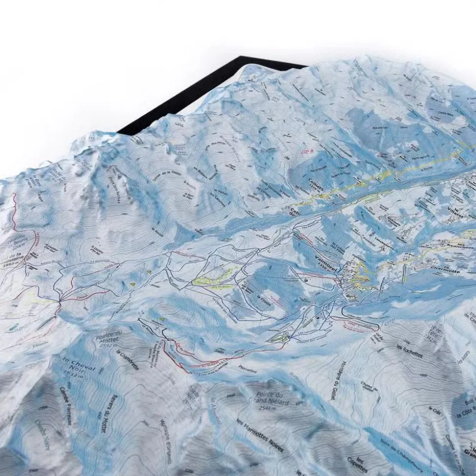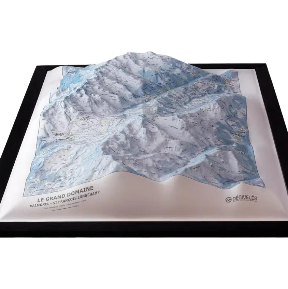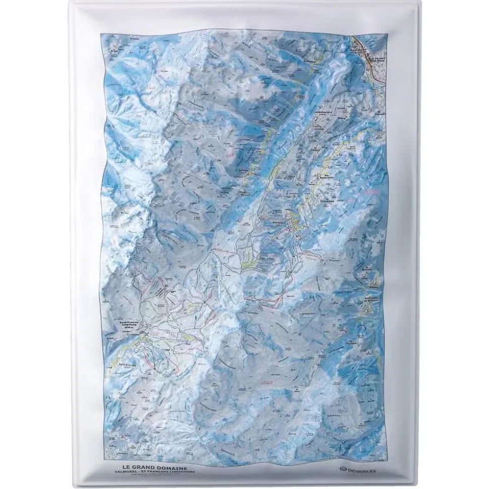 La carte enrelief Le Grand Domaine de la marque Deniveles offre une vision détaillée de cette partie des Alpes, avec ses sommets, ses villages et les stations de ski environnantes.