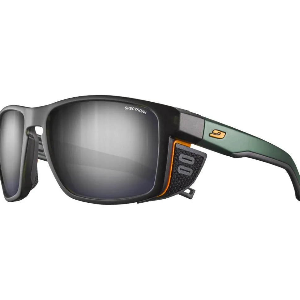 Les Julbo Shield Translucide Mat Vert Foncé Orange Spectron 4 sont des lunettes de soleil glacier polyvalentes dotées de verres de catégorie 4 pour les environnements très lumineux.