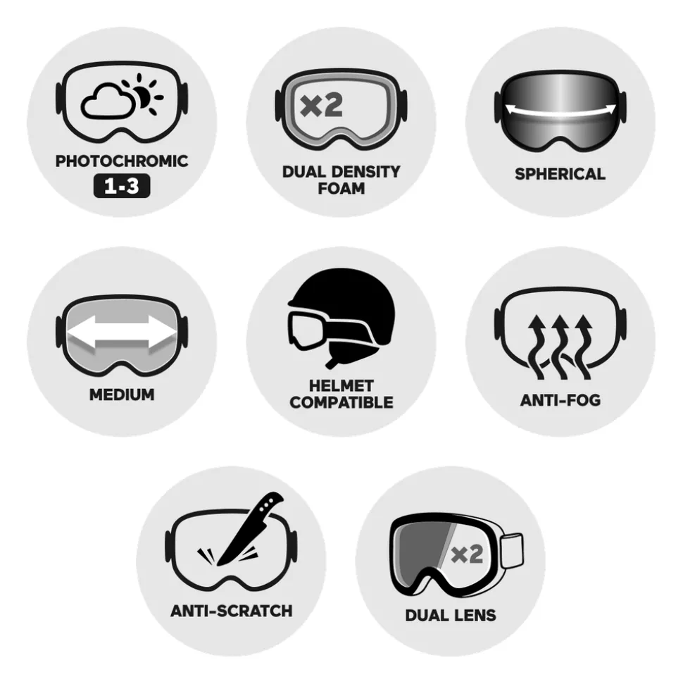 Ecran perforé pour améliorer la ventilationMousse double densitéCompatible avec le port du casqueEcran sphériqueDouble écran avec protection anti-rayuresTraitement anti-buée et anti-rayures -
