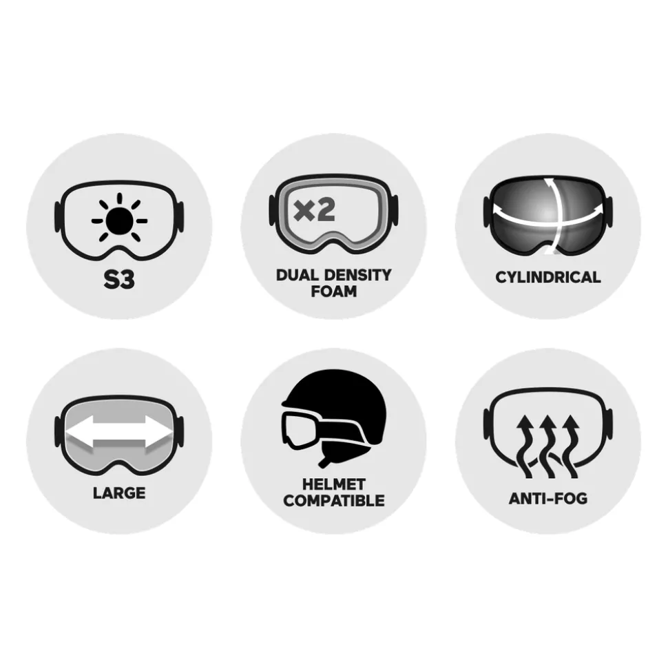 Ecran cylindriqueAir FlowFull Silicone StrapMousse double densitéOverstrapAjustement SymétriqueTraitement AntibuéeMonture AnatomiqueCompatible avec le port du casque -