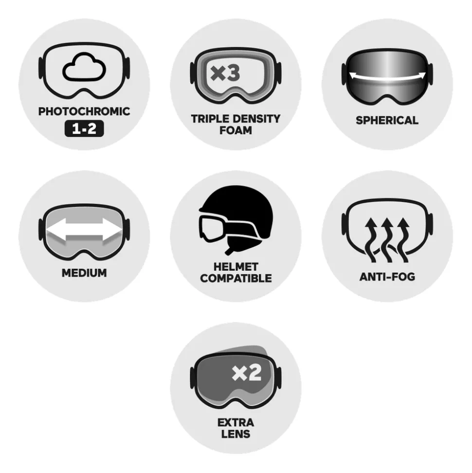 Ecran sphérique Carbonic-XEcran interne antibuée Fog-XTechnologie TLTCompatible avec le port du casqueMonture Responsive Fit™Système de réglage de strap QuickFitMousse triple densitéStrap en Silicone -