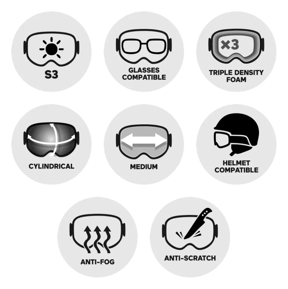 Traitement anti-buée et anti-rayuresCompatible avec le port du casqueEcran cylindriqueMousse triple densité -