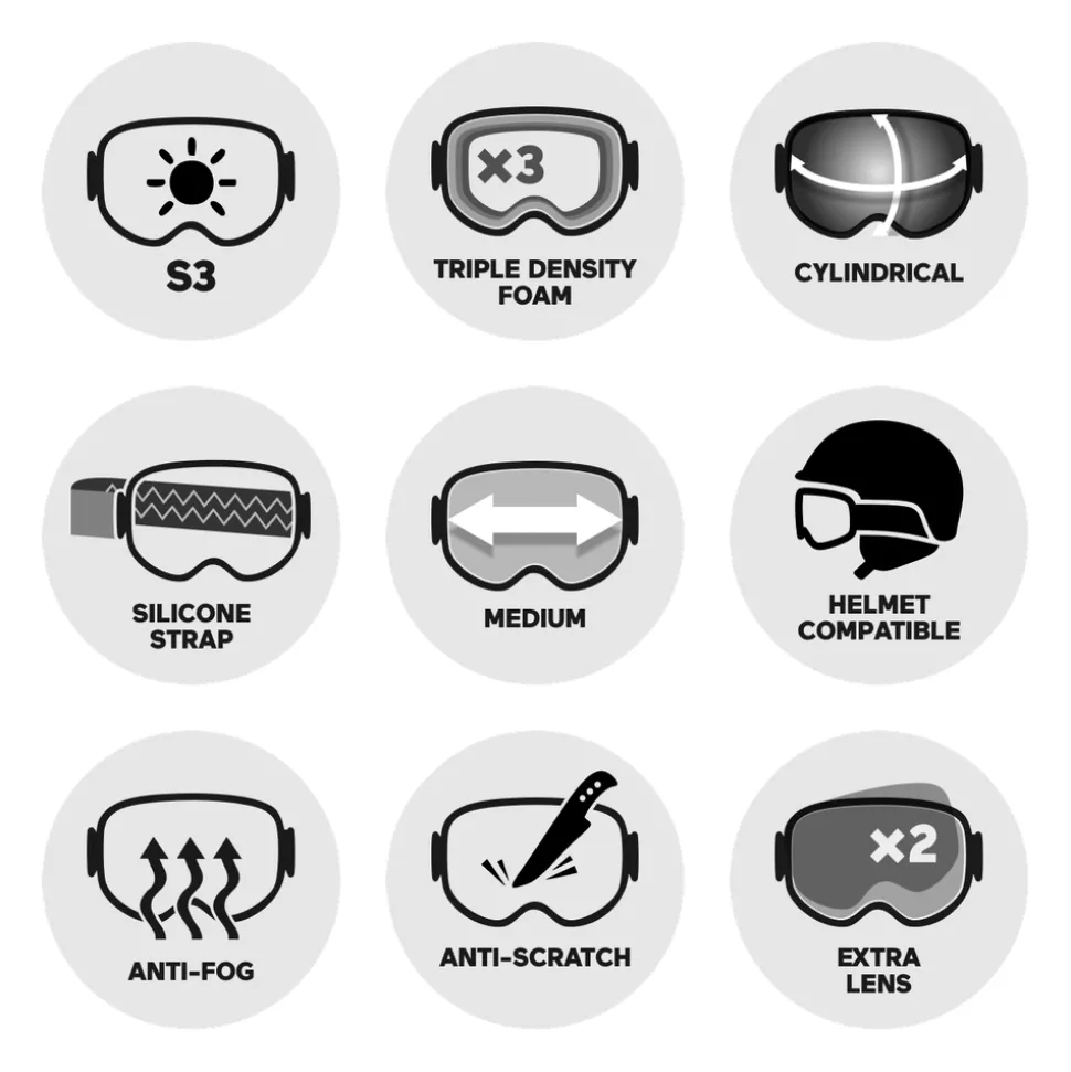 Ecran perforé pour améliorer la ventilationTraitement anti-buée et anti-rayuresMousse triple densitéStrap siliconéCompatible avec le port du casqueEcran cylindrique -