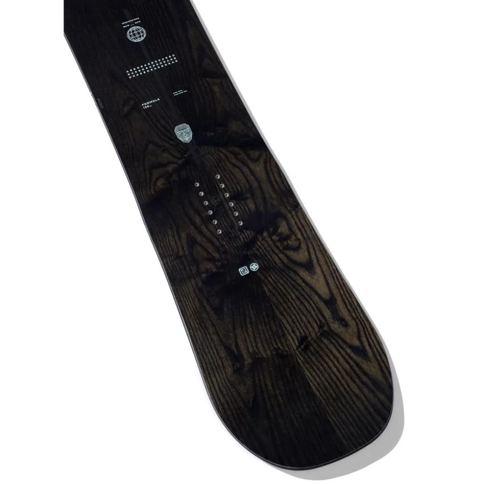 La Formula embarque un cambre classique qui donne une grosse accroche sur piste et du peps pour sauter haut,comme pour amortir la reception. Son shape twin directionnel, avec des inserts légèrement reculés, permet une meilleure maniabilité sur neige dure et dans la peuf tout en assurant la possibilité d’aborder les sauts en switch.
