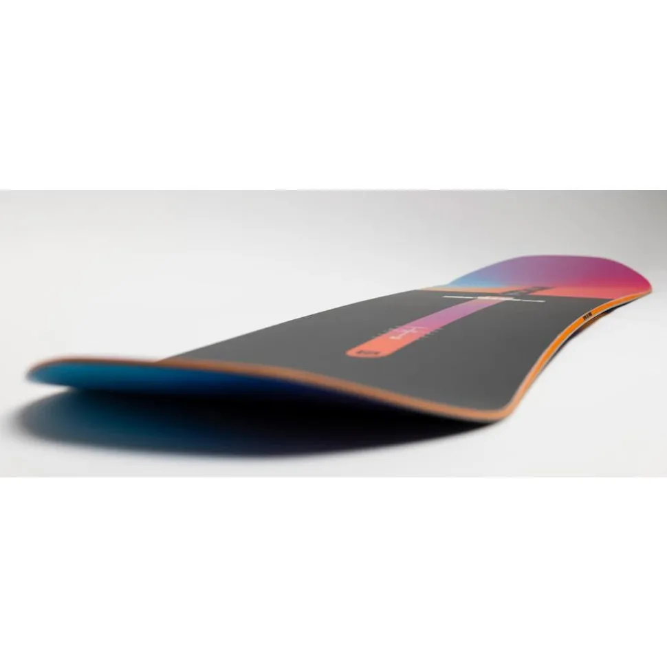 Cambre Plat : Le cambre plat pardonne plus facilement les erreurs qu’un cambre classique tout en restant plus stable qu’un cambre inversé. Il est plat entre les jambes et inversé en nose et en tail pour gagner en tolérance, mais aussi en déjaugeage et en portance en poudreuse. Un bon compromis pour ceux qui ne sont pas sûrs d’eux à 100%.
