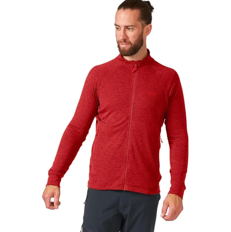 La polaire zippée RAB Nexus Jacket Tuscan Red, avec son polyester recyclé et son élasthanne, assure confort et mobilité pour la randonnée et l’alpinisme.