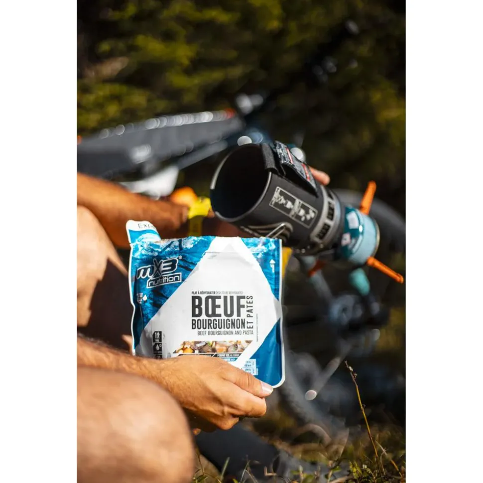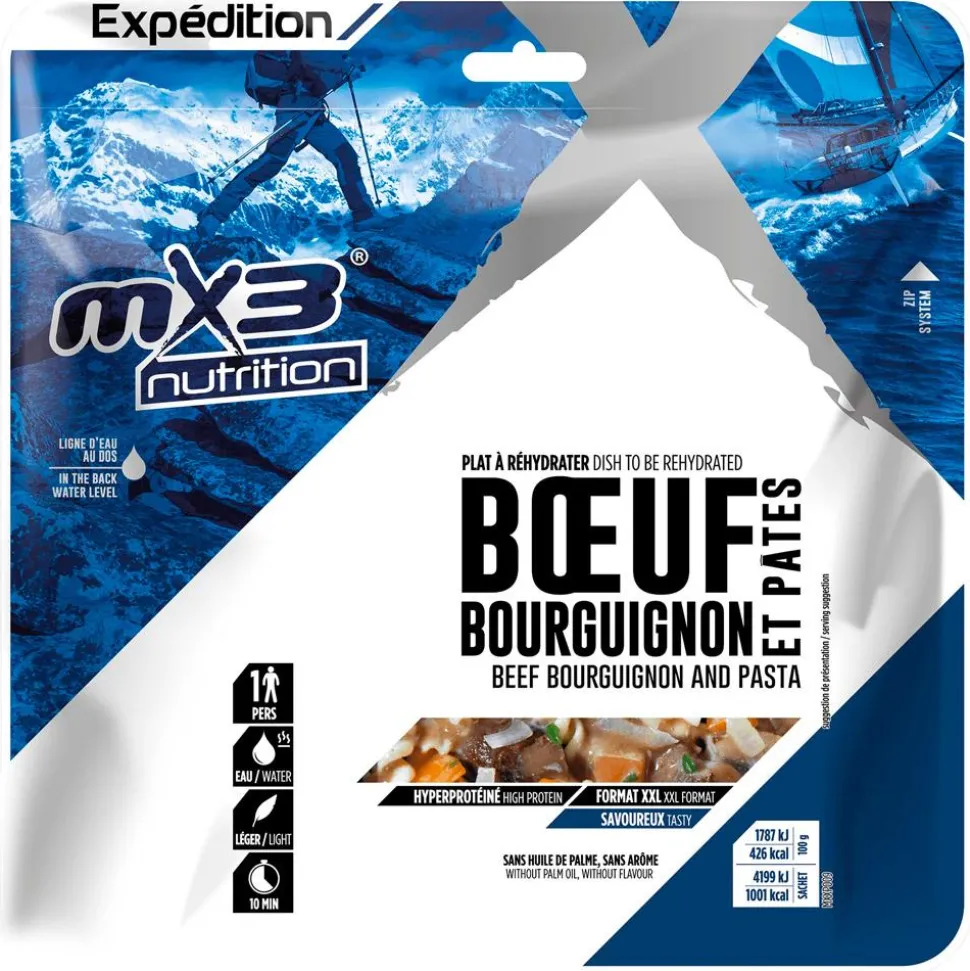 Le MX3 Bœuf Bourguignon & Pâtes est un repas lyophilisé énergétique et pratique, parfait pour les aventuriers appréciant la cuisine française traditionnelle.