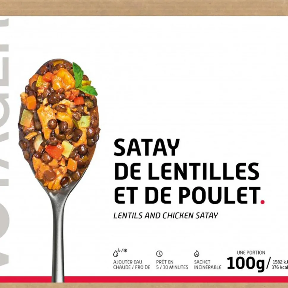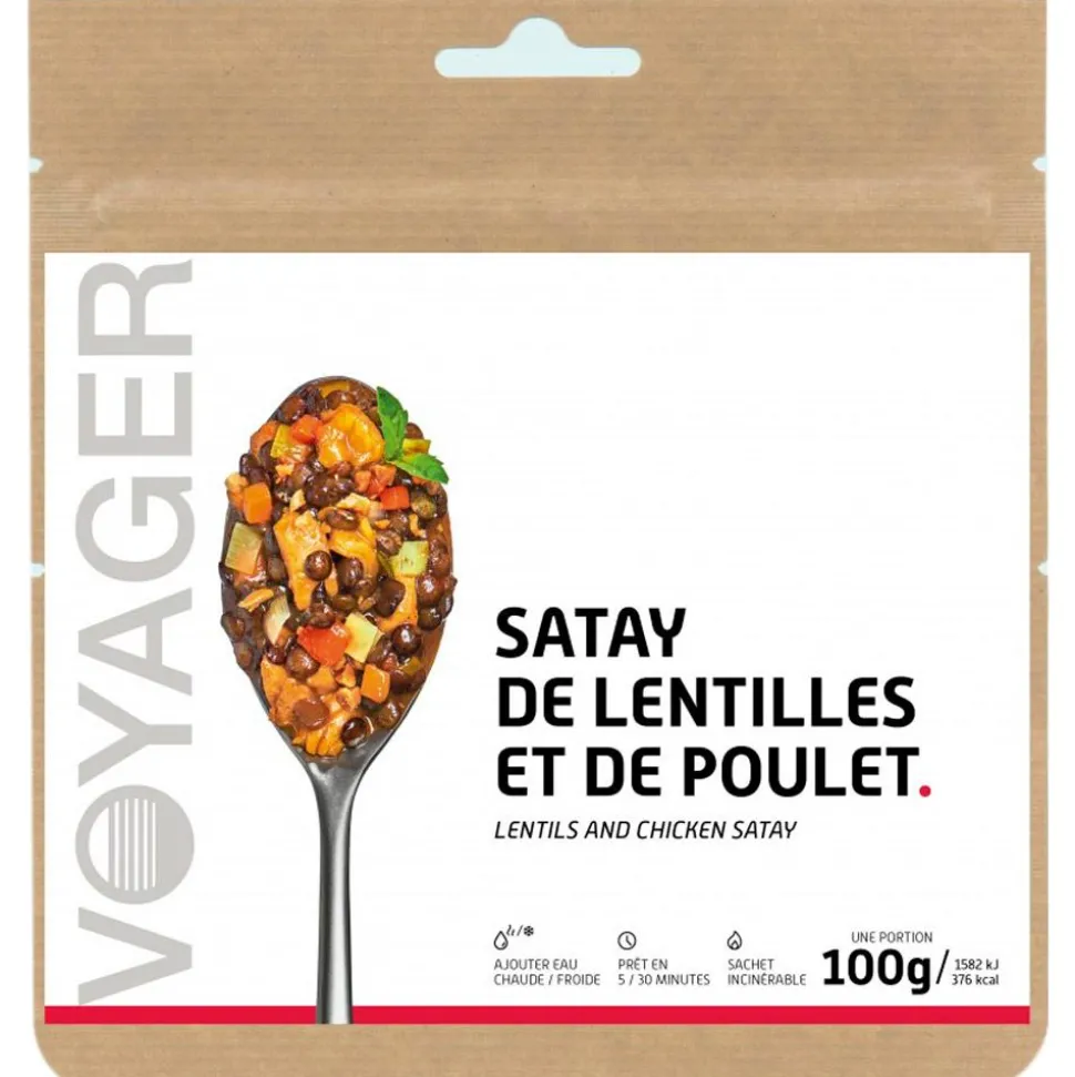 Le Satay De Lentilles Au Poulet est un savoureux plat lyophilisé sucré/salé concocté par la marque Voyager qui permet de reprendre des forces avant de reprendre votre activité sportive.