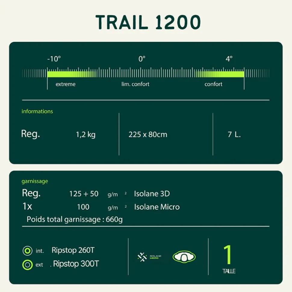 Caractéristiques du sac de couchage Trail 1200 :