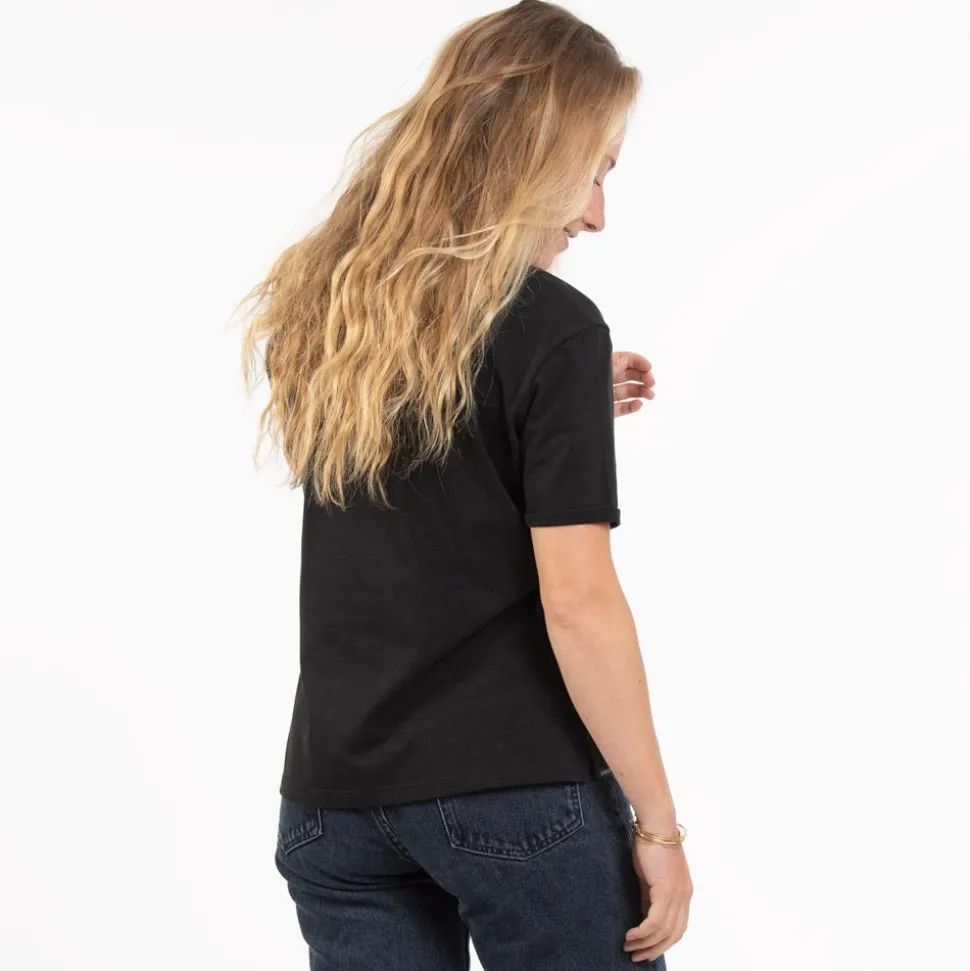 Prêt à vous accompagner au quotidien de la façon la plus confortable qui soit, le tee shirt femme coton bio Kolia Noir Bleu de la marque Animoz est également composé en chanvre et élasthanne